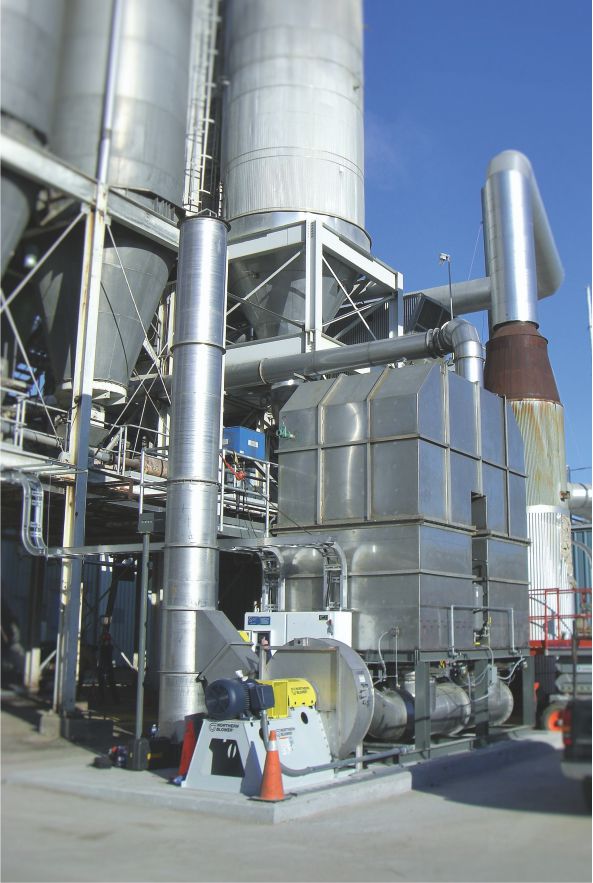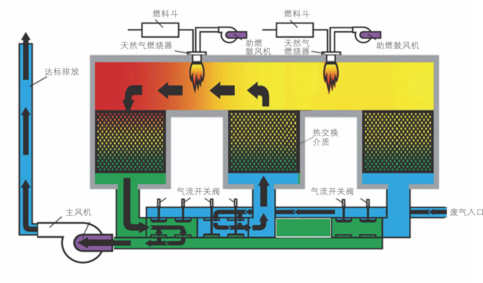 利用燃?xì)饣蛉加椭苯尤紵訜嶂?00℃以上,直接燃燒有機(jī)溶劑廢氣,有機(jī)溶劑分子氧化燃燒生成CO2與水。熱氧化燃燒產(chǎn)生的高溫氣體流經(jīng)特制的陶瓷蓄熱體,使陶瓷體升溫而“蓄熱”,此“蓄熱”用于預(yù)熱后續(xù)進(jìn)入的有機(jī)廢氣。從而節(jié)省廢氣升溫的燃料消耗。